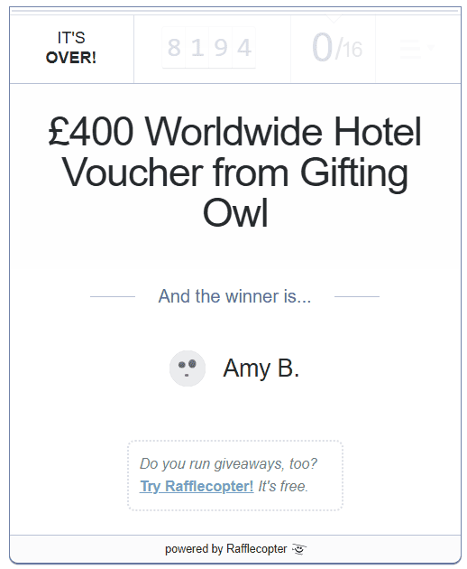 No purchase is necessary to enter or win. A purchase will not increase your chances of winning. The prize is a £400 hotel voucher provided by Gifting Owl. There will be one winner and the giveaway is open to worldwide entrants. The prize is not refundable or exchangeable for cash. The giveaway will run for 3 weeks starting on Monday 27th November 2023 and end at midnight on Sunday 17th December 2023. The winner will be determined on or around the 18th December 2023 by a random drawing of eligible entries received. Your chances of winning are determined by the number of eligible entries. Winners must respond within a week of receiving the notification email, otherwise another winner will be chosen. The winner’s name and email address will be passed to the giveaway sponsor in order to arrange delivery.