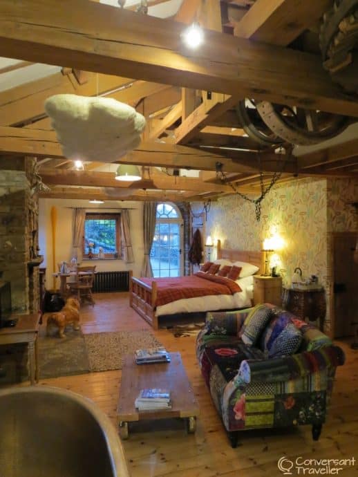 There are just 3 rooms, making it feel more like a home than a hotel, which is always a good thing. We opted for the Workshop, which is the largest of the 3 and came complete with working mill machinery, a free standing copper bath and a log burner. As well as a ceramic dog.
